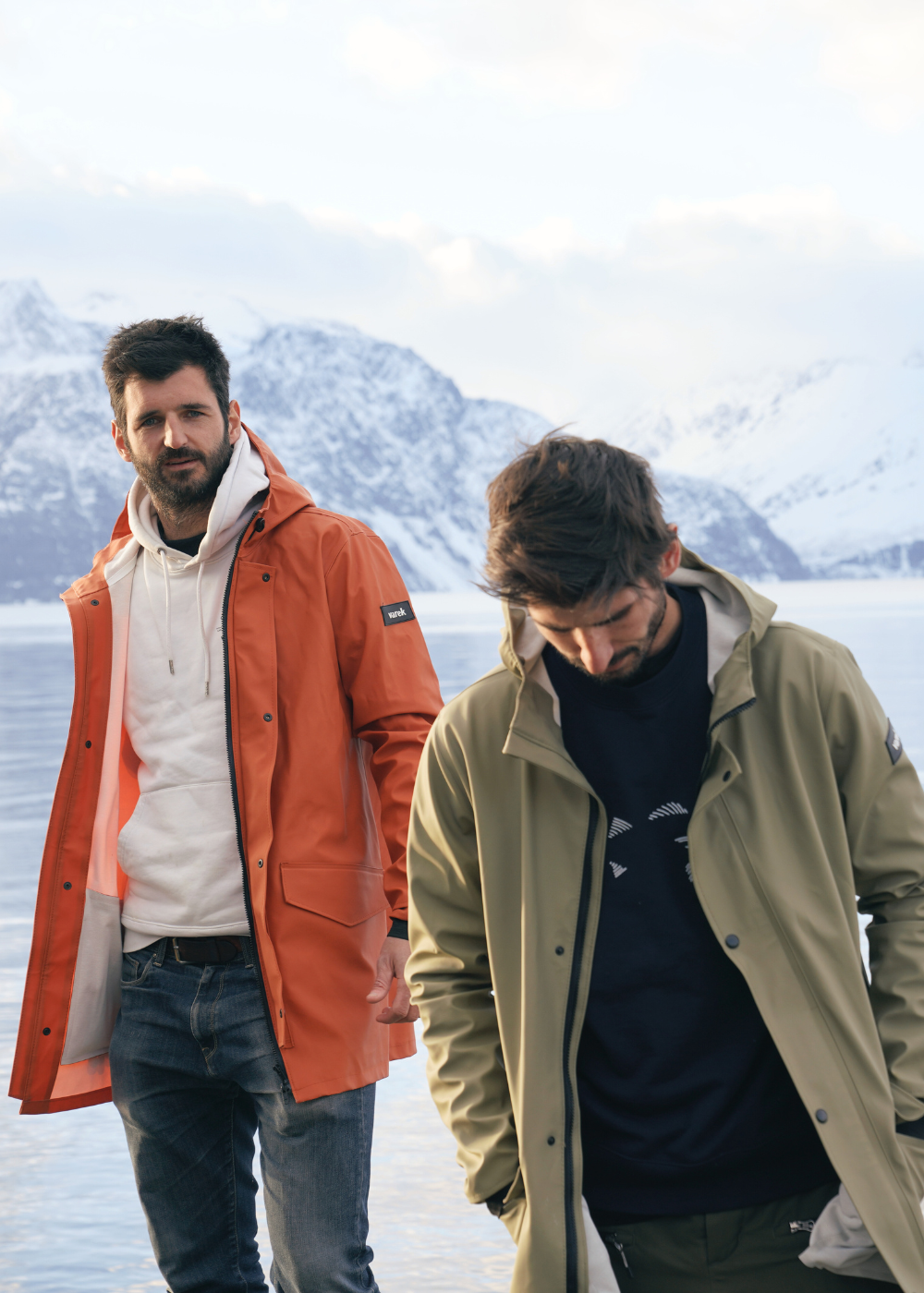 Nous avons pensé le ciré Varek comme un vêtement à la fois élégant et bien taillé, mais aussi robuste qu'un vêtement professionnel. Sa toile imperméable épaisse de 380 gsm et ses coutures thermosoudées en font une vraie armure contre la pluie.